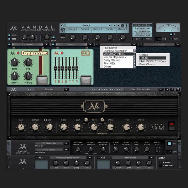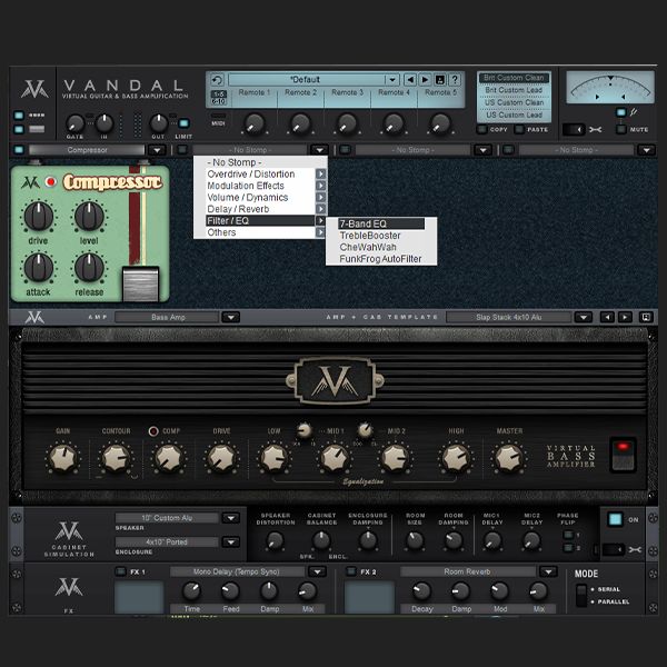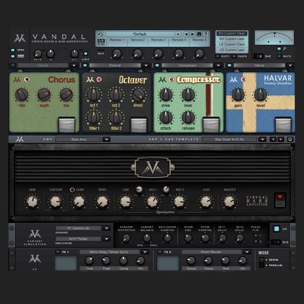 Vandal isn't simply trying to copy the sound of some legendary analog setup, instead it gives you access to a specially developed virtual pool of stompboxes, amps, cabinets and mics, so you can come up with your very own signature sound.