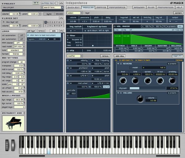 The Independence sampler offers a sophisticated virtual effects rack with hundreds of presets, filters and effects. Access over 45 powerful inserts, for instance Origami convolution reverb, which uses impulse responses. Origami is an impulse response engine for authentic reverberation rooms that's unbelievably powerful and realistic. Any adjustment and edit to impulse response files, and therefore your instrument setup, can be done in realtime within the loaded spaces.